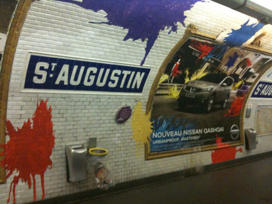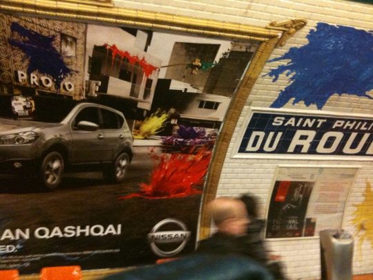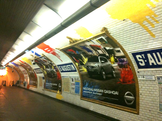 sur la ligne 9, Nissan a investi la station fantôme entre répu et strabourg st denis. c’est énorme!!!! il y a des voitures sur le quai et des « tâches » de peinture sur les murs!